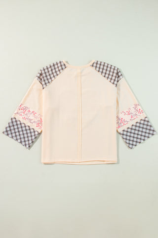 Beige Plaid Floral Peace Heart Graphic Wide Long Sleeve Top