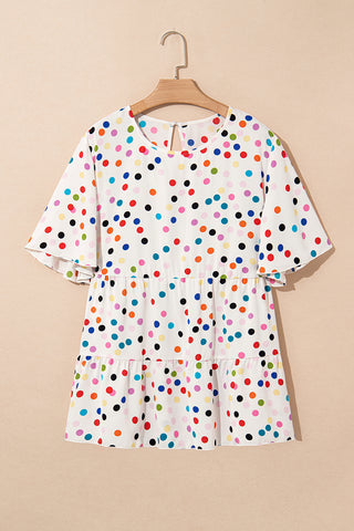 Beige Colorful Polka Dot Print Short Sleeve Ruffled Plus Size Babydoll Blouse