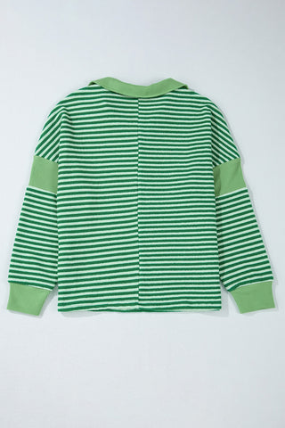 Green Stripe Turn-Down V Neck Patchwork Loose Top