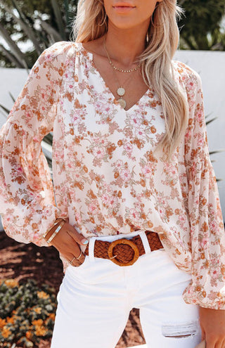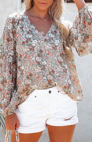 V-Neck Lantern Sleeve Curved Pendant Floral Print Chiffon Top